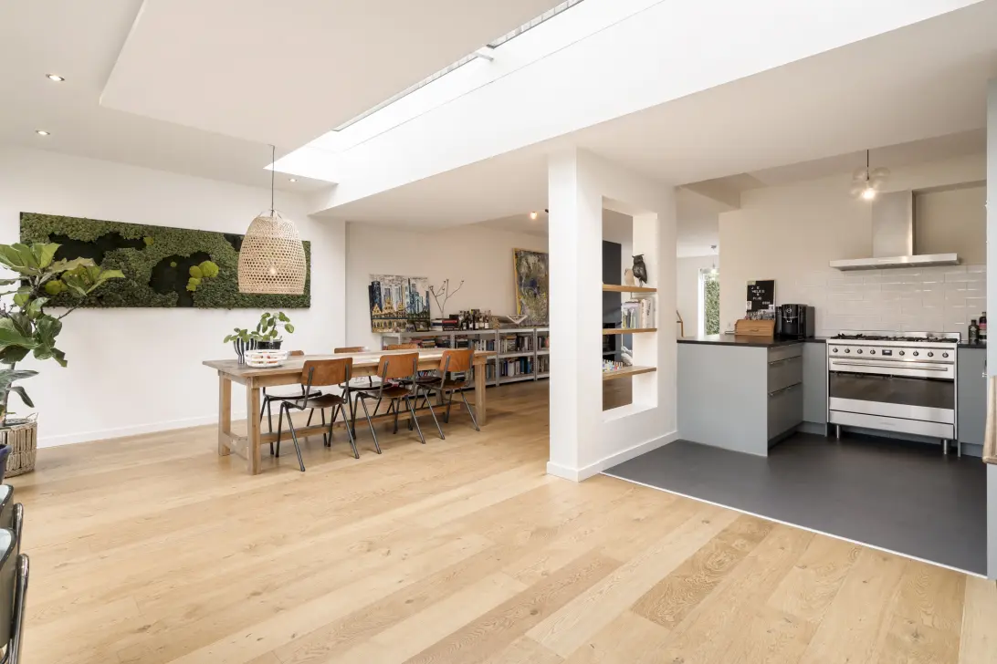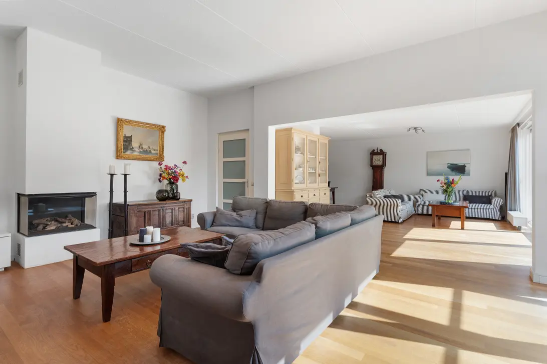 Naast de hal ligt de bijkeuken, voorzien van vaste kasten en een handige zijdeur naar buiten – de perfecte plek voor sportspullen, schoenen of andere dagelijkse rommel. Vanuit de hal stap je de enorme woonkamer in, die bestaat uit twee riante gedeeltes. De gashaard zorgt in de winter voor warmte en sfeer, terwijl de twee schuifpuien de verbinding met buiten maken. Eén schuifpui leidt naar de overdekte serre: een heerlijke extra leefruimte waar je beschut zit en het elektrisch te bedienen dak open kunt zetten als de zon schijnt. Hier zul je ongetwijfeld veel tijd doorbrengen.