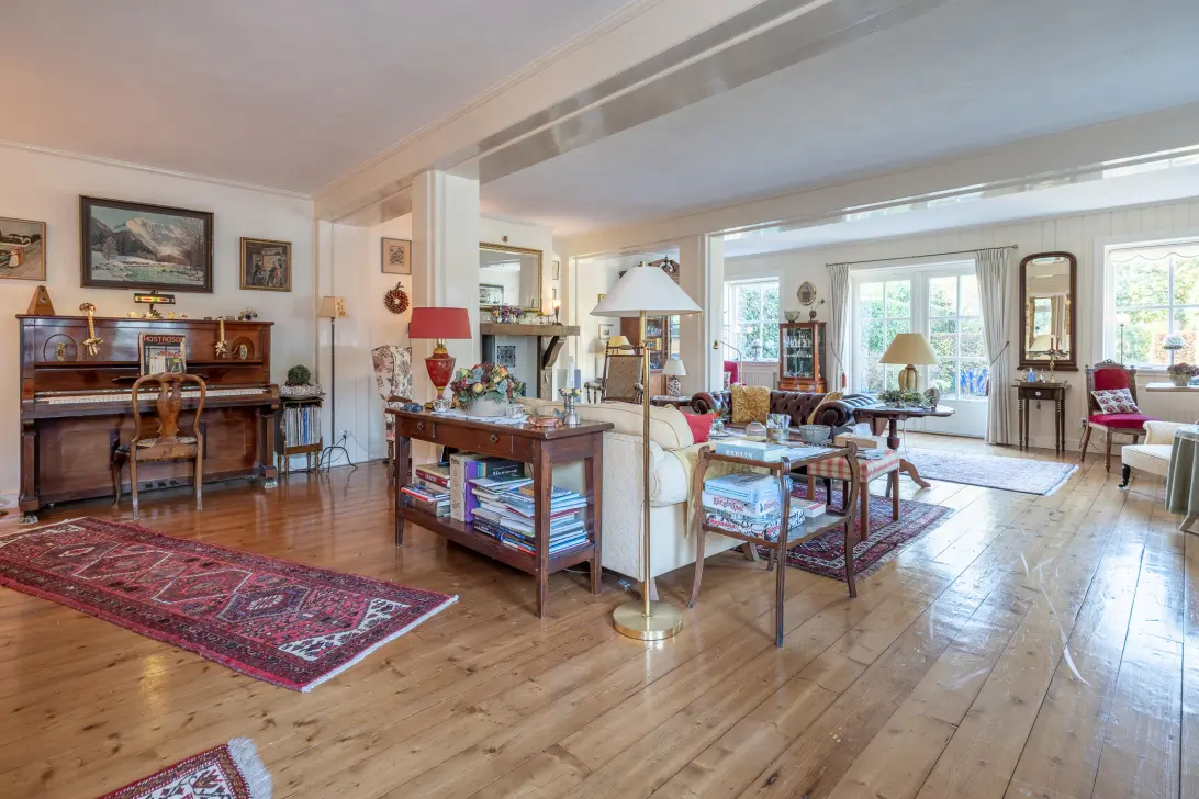 De zeer lichte woonkamer met open haard heeft aan de achterzijde openslaande deuren en loopt u zo de zeer diepe zonnige tuin op het westen in.