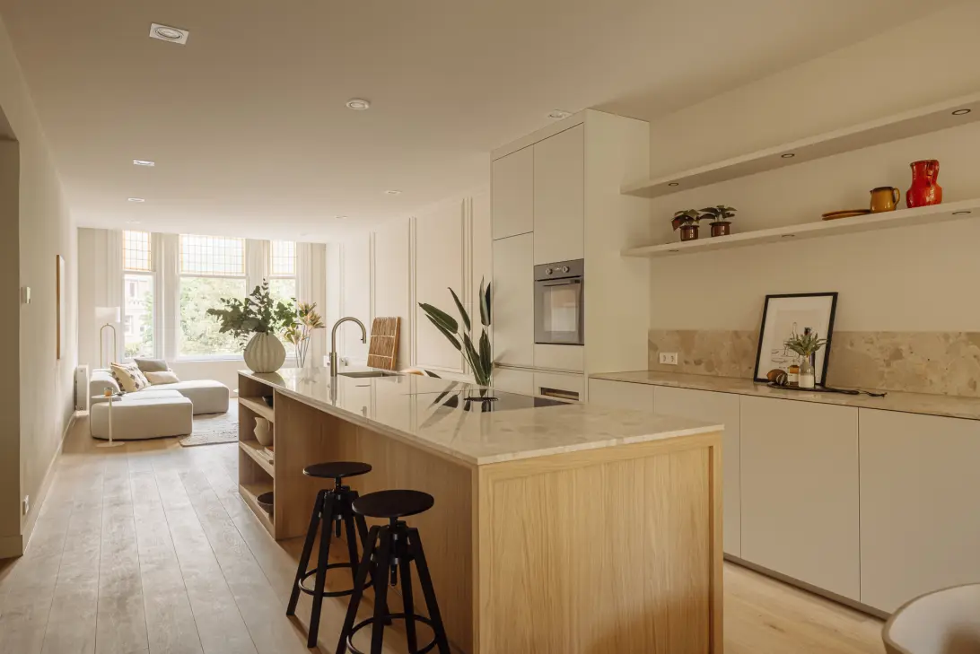 Toegang tot de woning via lift of het authentieke trappenhuis met glas-in-loodramen. De entreehal is royaal en licht, en vormt de opmaat tot een ruimtelijke woonverdieping die zich uitstrekt van voor naar achter. Aan de straatzijde ligt het zitgedeelte, met als blikvanger het balkon aan de voorzijde, een fijne plek om de seizoenen te ervaren, verscholen achter het groen. De eetkamer ligt aan de achterzijde en staat via openslaande deuren in verbinding met het zongerichte terras. De aangrenzende woonkeuken is voorzien van een maatwerk interieur, uitgevoerd in hout met een natuurstenen blad. Het kookeiland met barfunctie nodigt uit tot informeel samenzijn, terwijl de lengte en breedte van de ruimte zorgen voor lucht en licht. De hoogwaardige afwerking en het zorgvuldige lijnenspel maken deze woonlaag tot een ingetogen, maar uitgesproken geheel. Aan de achterzijde van de woning ligt de hoofdslaapkamer, ruim, stil en met grote ramen op het zuidwesten. Direct verbonden met deze kamer is een royale kleedruimte, voorbereid op een maatwerk inrichting. De ruimte is vrij indeelbaar en biedt volop mogelijkheden voor kastruimte. De badkamer ligt apart, centraal op de verdieping. Hier komen luxe en functionaliteit samen in een vrijstaand bad, een royale inloopdouche, dubbele wastafel en toilet. Aan de voorzijde ligt een tweede slaapkamer, ideaal als werkruimte of logeerkamer. Aan de gang is een tweede toilet en bergruimte met wasmachine aansluiting. De combinatie van licht, rust en heldere indeling maakt deze woonlaag tot een aangename privézone binnen het huis.