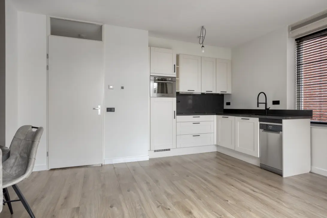 De lichte woonkamer heeft aan de achterzijde een grote raampartij met een openslaande deur naar een ruim balkon met vrij uitzicht over de omgeving. In de woonkamer bevindt zich een bergkast. De L-vormige keuken ligt aan de achterzijde en is voorzien van een zijraam. In de keuken is de volgende apparatuur is aanwezig: een oven, een magnetron, een inductiefornuis en een koelkast met vriezer, vrijstaande vaatwasser. De woning heeft een strakke en neutrale afwerking. Op de vloer ligt, met uitzondering van het sanitair, laminaat met eronder vloerverwarming.