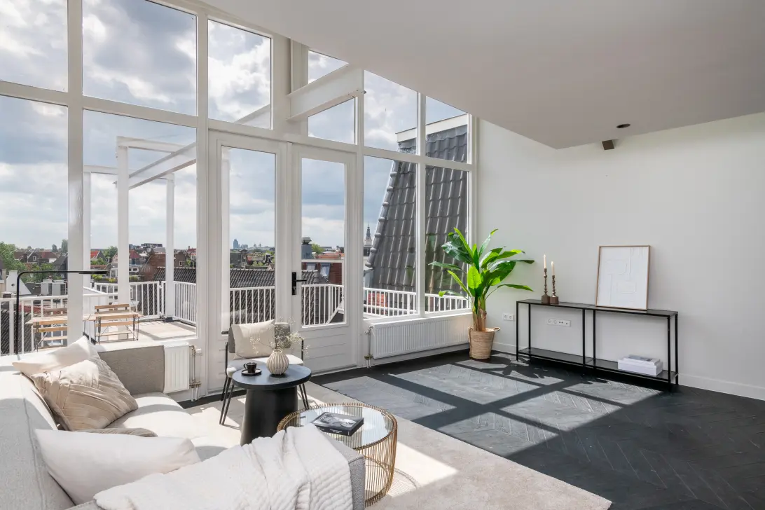 Entrance of the apartment on the fourth floor, on this floor you will find the open kitchen and living room, the bathroom with walk-in shower and bath. From the living room, you reach the spacious and sunny roof terrace at the front. The living room has a ceiling height of over 3.7 meters!
