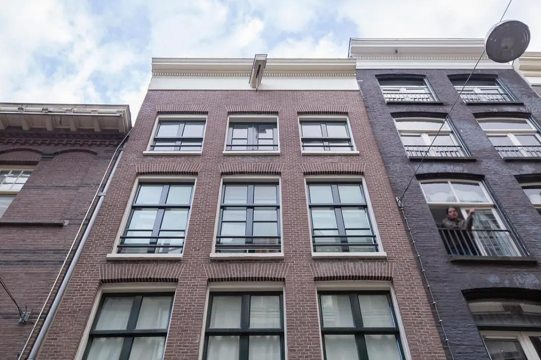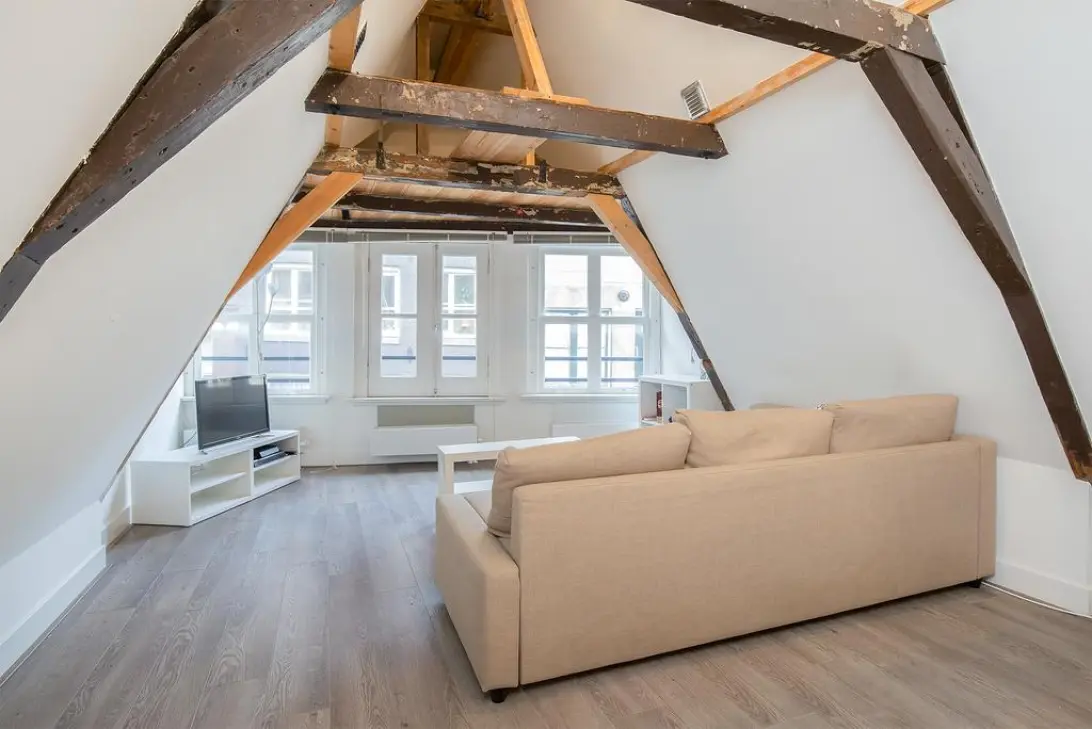 The bedroom is located at the rear with a unique view of the Oude Kerk.