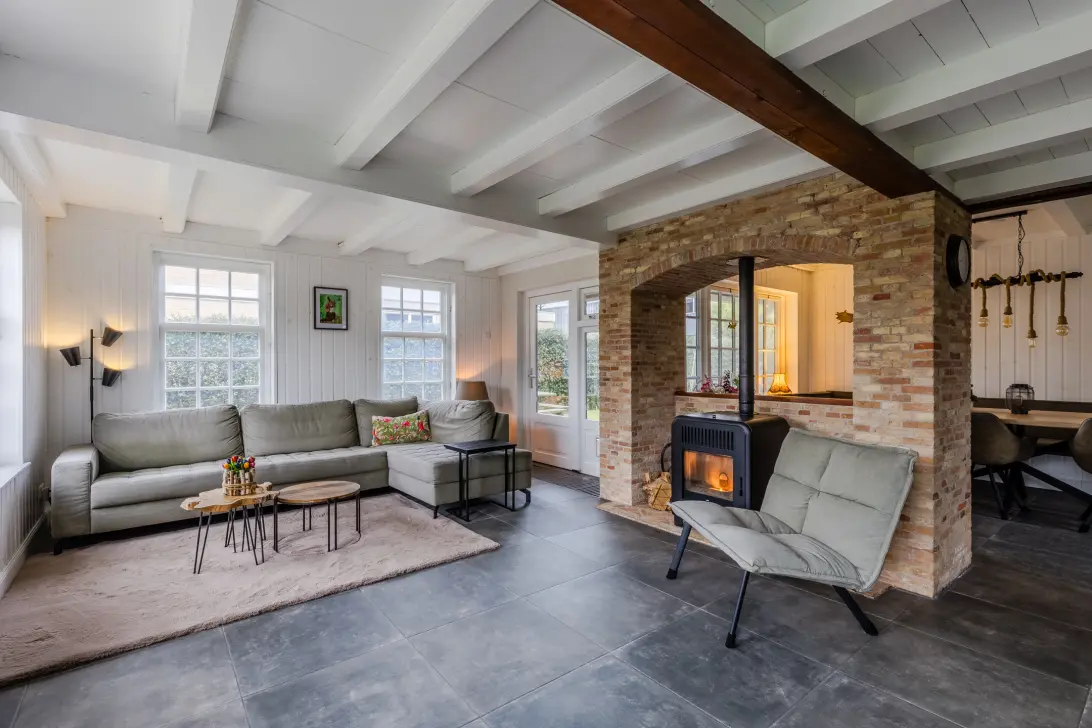 De royale woonkamer is afgewerkt met een donkere tegelvloer en voorzien van een balkenplafond. Centraal in de ruimte bevindt zich een sfeervolle kachel. Dankzij de aanwezigheid van grote raampartijen valt er veel natuurlijk licht binnen.