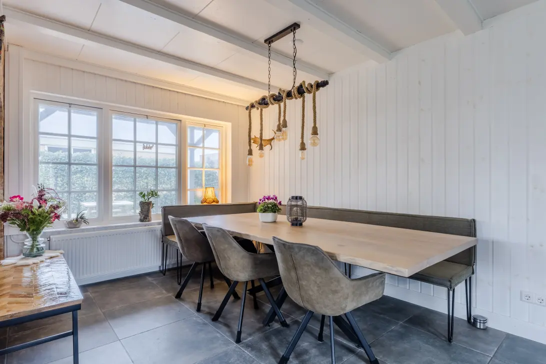 • Royale woonkamer met balkenplafond en grote raampartijen