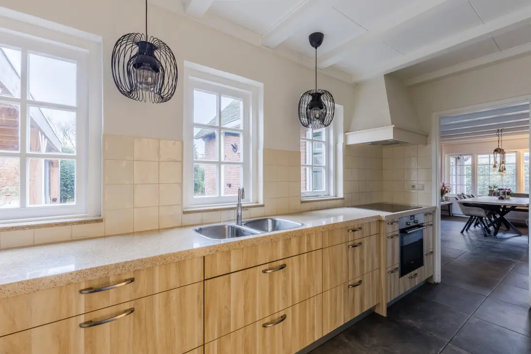 De keuken is ruim opgezet en bestaat uit een keukenblok en een kastenwand. Het geheel is afgewerkt met houtkleurige kastjes. De keuken is uitgerust met de volgende apparatuur: vaatwasser, inductie fornuis, afzuigkap, Amerikaanse koelkast met ijsblokjes en Quooker. Er is verder volop kastruimte aanwezig.