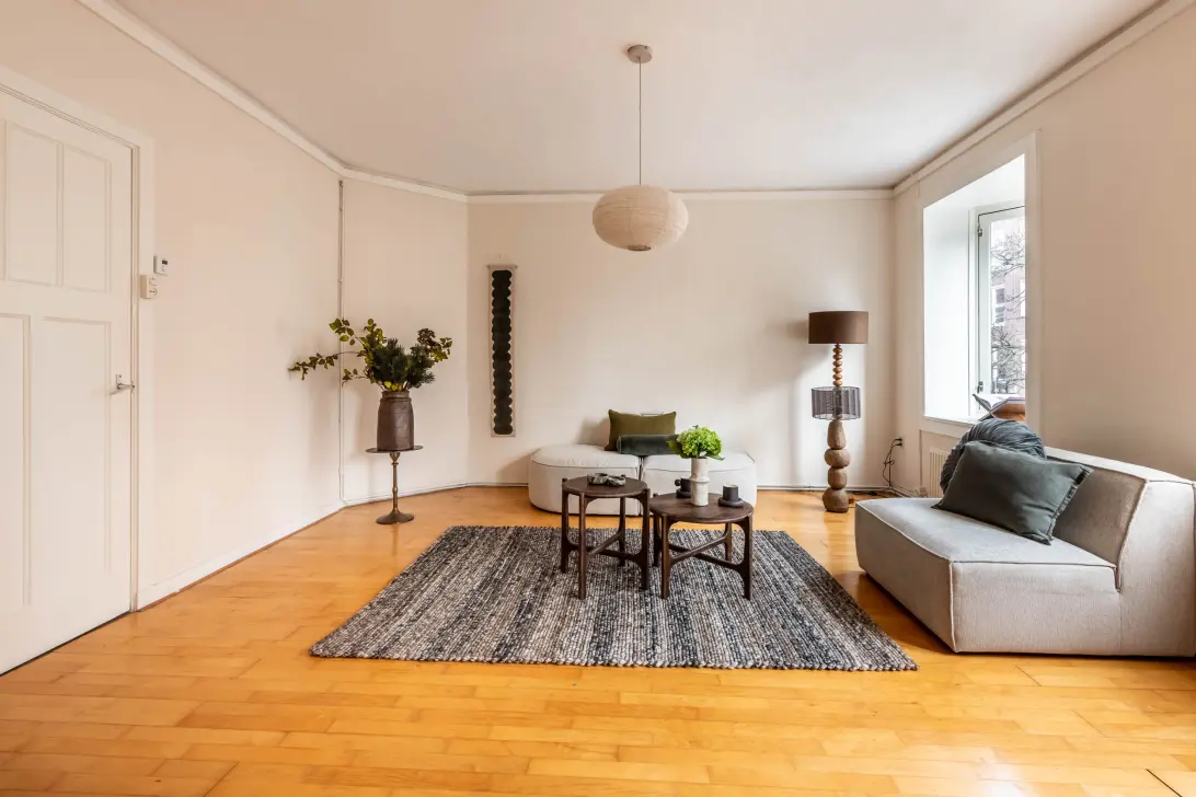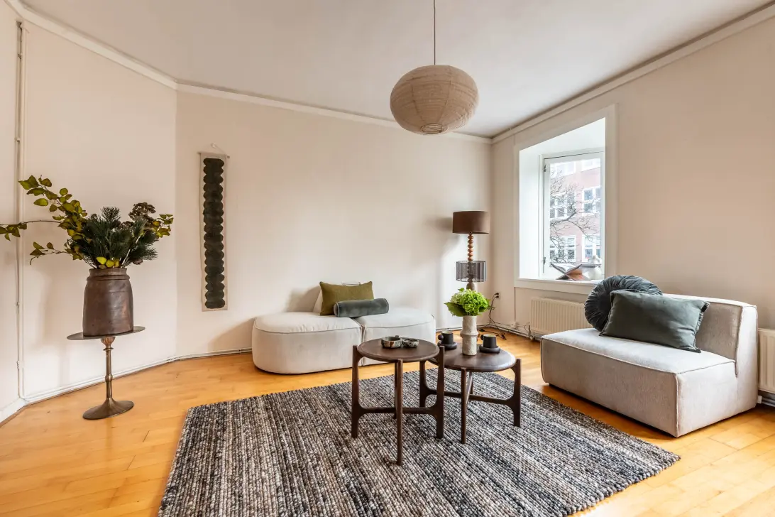 De woonkamer is gelegen aan de voorzijde van het appartement en heeft hoge plafonds. Direct valt de 6,82 meter breedte van de woning op, wat versterkt wordt door de uniek vormgegeven erker en raamkozijnen, die uitgevoerd zijn in isolatieglas. In de ruimte zijn verschillende vaste kasten aanwezig.