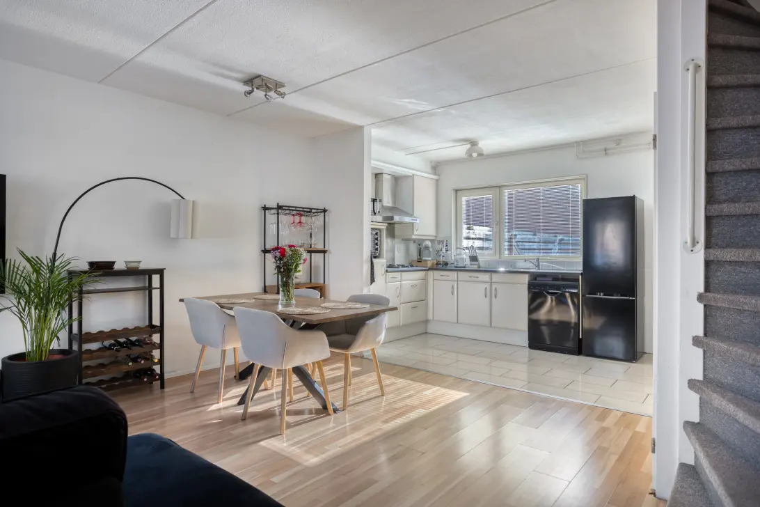 De woonkamer kenmerkt zich door een prettige lichtinval en beschikt over een open trap naar de eerste verdieping. Onder de trap bevindt zich praktische bergruimte. De open keuken is aan de achterzijde gesitueerd en opgesteld in een hoekopstelling. De keuken is voorzien van een gascomfort en afzuigkap en biedt een functionele werk- en opbergruimte. Aan de achterzijde van de woning bevindt zich het toilet met fonteintje. Hier is tevens een deur naar het achtergelegen berghok met directe toegang tot de tuin.