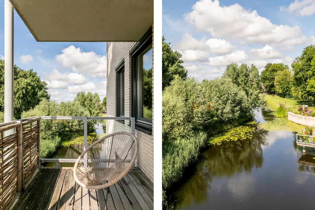 De woonkamer is zeer licht door de vele raampartijen en heeft een mooie brede maatvoering. Naast de royale hoofdslaapkamer met fraai ingebouwde kasten en een ruime badkamer ensuite, zijn er nog 2 andere slaap- c.q. werkkamers en een 2e gastenbadkamer. Ook de entree is ruim met ingebouwde garderobekast. Vanuit de keuken is er een prachtig uitzicht over het groen en het water; de naastgelegen bijkeuken biedt ruimte voor een wasmachine, droger en extra ijskast. Kortom: een mooi verzorgd en vooral licht en ruim appartement op een centrale locatie.