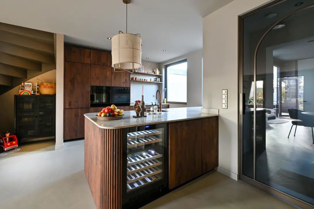 Aan de voorzijde van de woning ligt een nette voortuin met ruimte om fietsen gemakkelijk te stallen. U komt binnen in een ruime en lichte hal met garderobe en modern toilet met urinoir. Vanuit de hal loopt u de royale woonkamer met open keuken binnen, een plek waar wonen en koken harmonieus samenkomen. De luxe keuken uitgevoerd in Amerikaans notenhout is gelegen aan de voorzijde en voorzien van alle gemakken: stoomoven, combimagnetron, dubbele spoelbak, vaatwasser, Bora-kookplaat met geïntegreerde afzuiging, een grote koelkast van plafond tot plint én een ruime vriezer. Het stijlvolle werkblad van kwartsiet (natuursteen) met mooie afrondingen en de royale kastruimte maken het tot een genot om hier te koken.