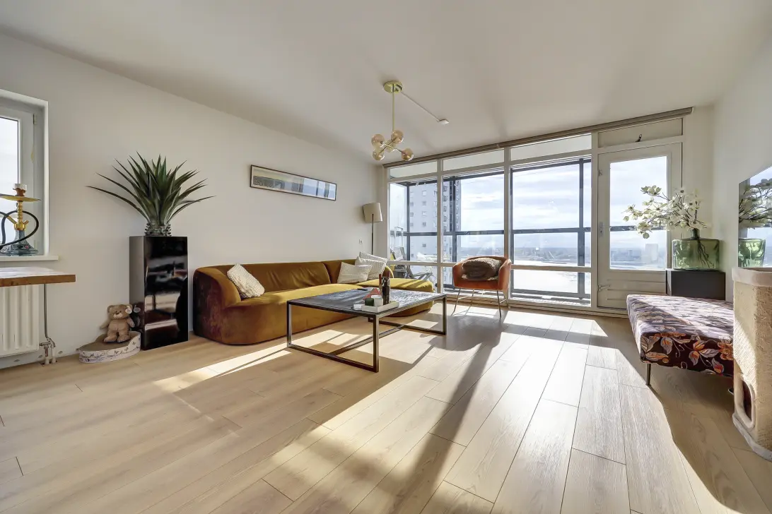 Located along the banks of the Maas, this 83m² three-room apartment has a south-facing balcony on the 14th floor and offers stunning views of the Maas and the city of Rotterdam.