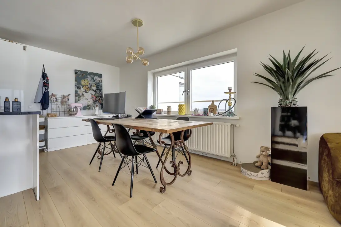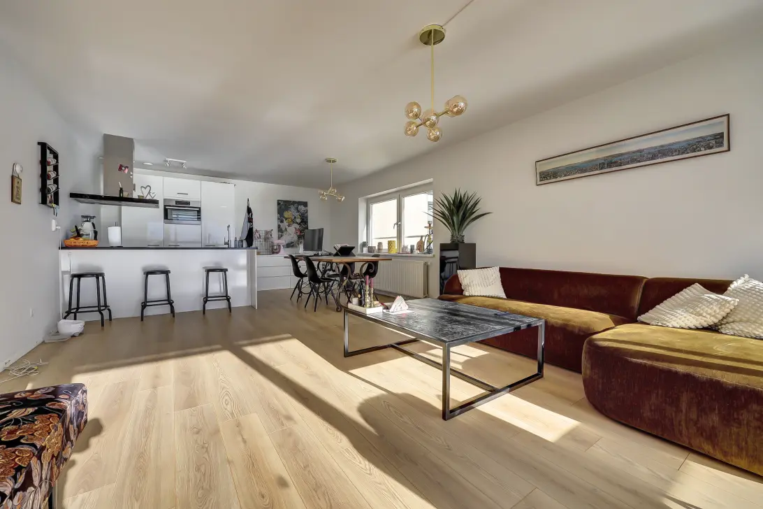 Layout of the flat:Spacious entrance hall with built-in storage room, toilet, spacious bathroom with shower, bath and washbasin. Living room with lots of windows, providing plenty of light and beautiful views. Open kitchen with kitchen unit. The south-facing balcony is accessible from the living room.