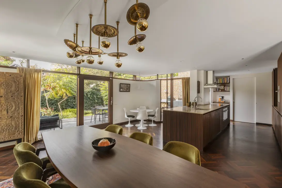 De eetkamer, gesitueerd aan de tuinzijde, vangt het daglicht optimaal en loopt vloeiend over in het buitengebied via het terras. In de afwerking is zorgvuldig gekozen voor natuurlijke materialen — hoogwaardige hout voor de vloer en kozijnen van de uitbouw en natuursteen op het terras.