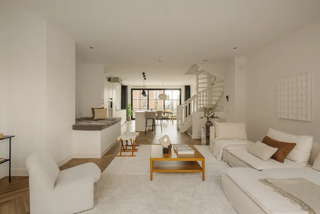 - Een riante, open doorzonwoonkamer met grote raampartijen en een indrukwekkend hoog plafond;