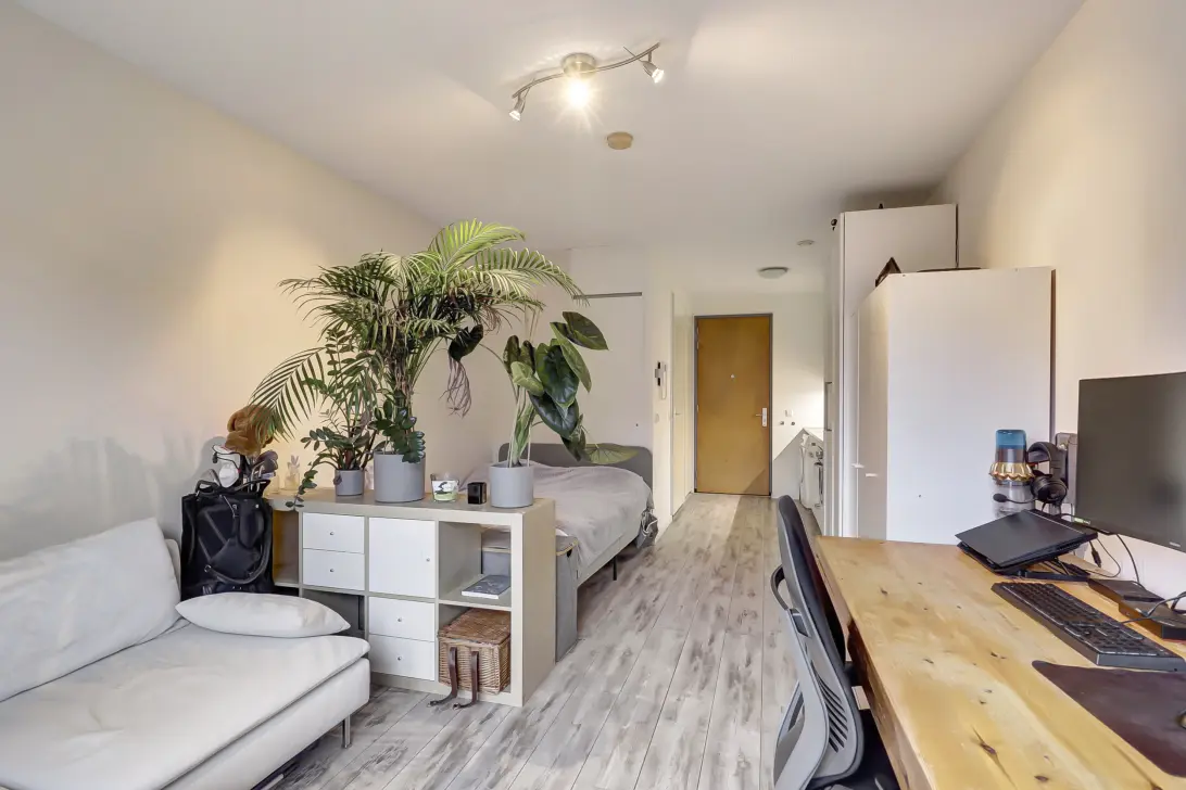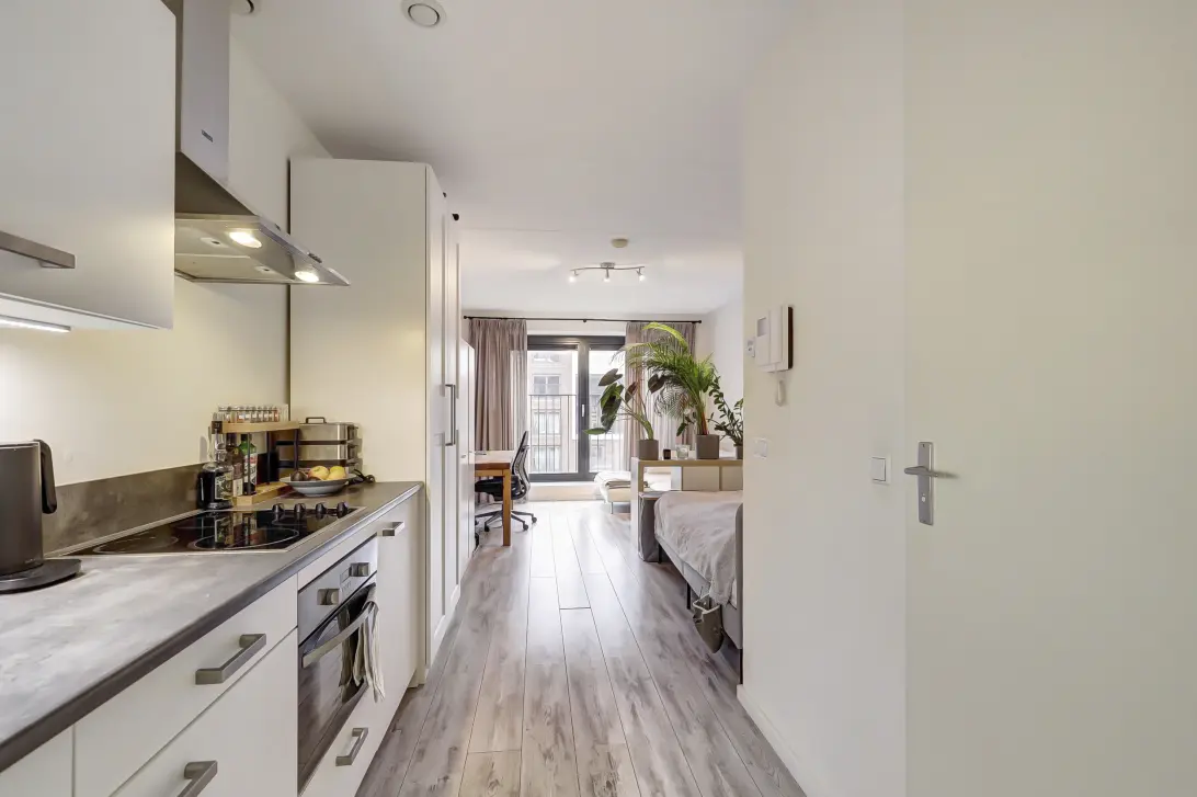 De woonruimte voelt verrassend ruim door de slimme indeling en het vele licht. De moderne open keuken is uitgerust met een combi magnetron, inductiekookplaat en koel vriescombinatie. Ook is er een wasmachine aanwezig. De badkamer is netjes afgewerkt en voorzien van een douche, wastafel en toilet. De studio biedt voldoende ruimte voor een woon en slaapgedeelte.