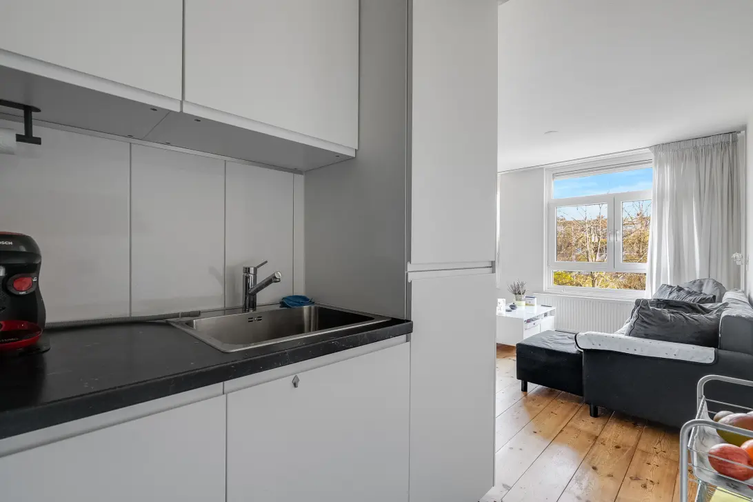 Entree appartement, via de hal heb je toegang tot de ruime woonkamer en de halfopen keuken. Tevens is vanuit de hal de slaapkamer te bereiken met aangrenzend het balkon welke is gelegen op het oosten. De badkamer is voorzien van wastafel, douche en wasmachineaansluiting.