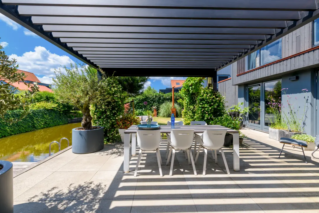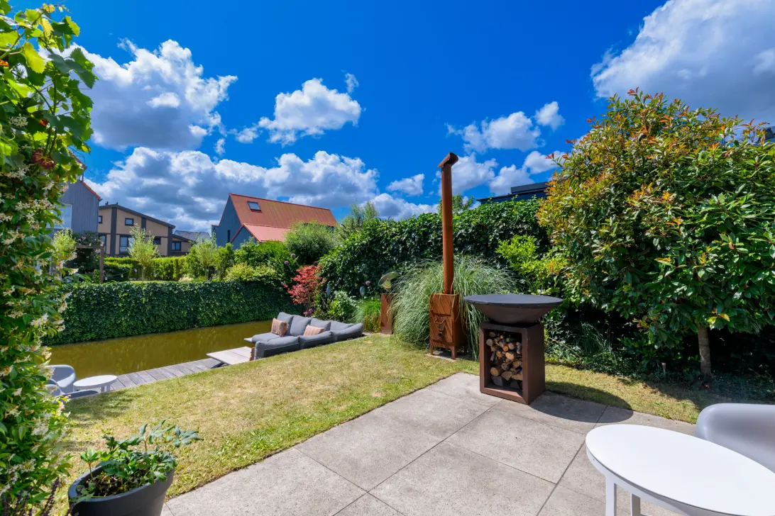 De fraai aangelegde grote tuin ligt rondom de villa en is voorzien van verschillende plekjes en waar een heerlijk terras is met overkapping om in de schaduw te zitten. Deze elektrisch aangestuurde overkapping is van het merk Renson. Aan de tuin heb je een eigen steiger voor de boot en vanaf hier kun je eenvoudig het water op en heerlijk urenlang ronddobberen in de vaargangen van De Krijgsman. De verlichting in de tuin en op de steiger maken het af. Ook het parkeren is voorzien op eigen grond. Twee parkeerplaatsen zijn aan de voorzijde gesitueerd met een oplaadpunt voor je elektrische auto.