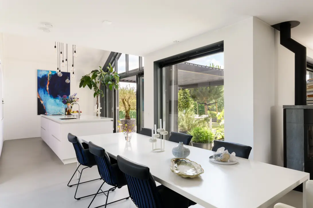 De keuken is voorzien van een riant kookeiland, gericht naar de tuin en via de openslaande deuren loop je zo het terras op. De nokhoogte in de keuken is ruim 4 meter hoog.