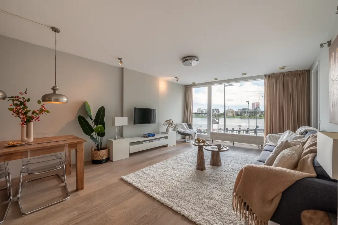 De woonkamer wordt gekenmerkt door de grote ramen van vloer tot plafond, die de volledige breedte van het appartement beslaan, met een magnifiek uitzicht over het water van het IJ, richting Amsterdam-Noord.