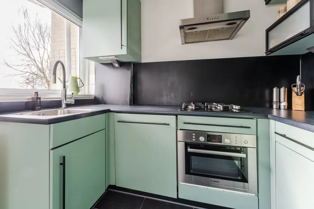 De royale doorzonwoonkamer is voorzien van een fraaie vloer en keurig afgewerkte wanden. Hier is volop ruimte voor een comfortabele zit- en eethoek. Dankzij de brede raampartij aan zowel de voor- als achterzijde valt er veel natuurlijk licht naar binnen. In de halfopen keuken ligt een zwarte tegelvloer met vloerverwarming. De keuken zelf is uitgevoerd in een U-opstelling en heeft groene keukenkastjes en een donker werkblad. Hier tref je een vaatwasser, gasfornuis, afzuigkap, oven, koelkast en vriezer aan.