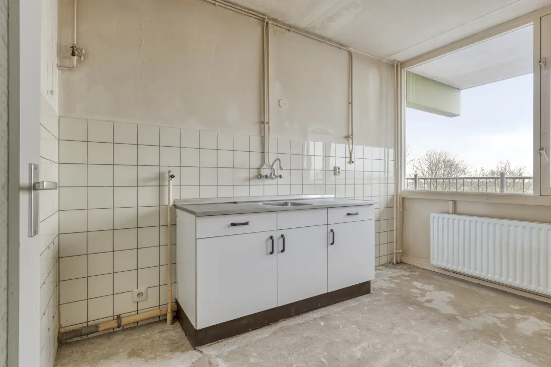 De keuken, gelegen aan de voorzijde van de woning, bevindt zich nog in originele staat. Hoewel gedateerd, biedt het een mooie kans om een stijlvolle, nieuwe keuken in te richten. De recent aangelegde perilex-aansluiting betekent dat u kunt kiezen voor moderne inductiekookplaat.