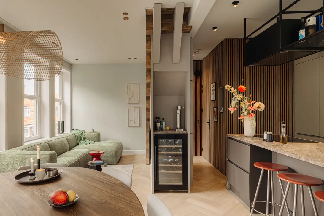 Bij binnenkomst op de derde verdieping betreed je direct de ruime en lichte woonkamer met een prachtig uitzicht over de Westlandgracht. Dankzij de grote raampartijen en de plafondhoogte van 2,76 meter voelt deze ruimte bijzonder ruimtelijk aan. De open eetkamer loopt vloeiend over in de luxe afgewerkte keuken voorzien van moderne inbouwapparatuur zoals een vaatwasser, koelkast, vriezer, quooker, stoomoven, combi oven-magnetron, inbouwkoffie apparaat, inductiekookplaat, wijnklimaatkast, een kookeiland en veel kastruimte.