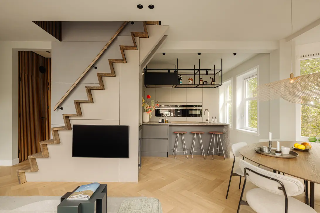 De woning is volledig voorzien van een prachtige visgraat vloer, strak gestuukte wanden + plafonds en dimbare inbouwspots aangestuurd door een domoticasysteem. Het interieur is met veel zorg samengesteld, indien gewenst is het meerendeel beschikbaar ter overname zodat verhuizen nog makkelijker wordt!