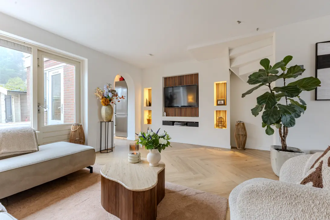 In de hal vind je de garderobe, toegang tot het toilet en de doorgang naar de woonkamer. Zodra je binnenstapt, proef je de sfeer van de recent gemoderniseerde woonkamer. De luxe visgraat PVC-vloer en strak gestuukte wanden en plafonds vormen een rustige, moderne basis.