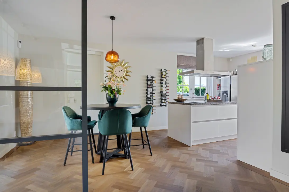 De open keuken vormt een waar pronkstuk: strak vormgegeven, met een royaal kookeiland met marmeren keukenblad en hoogwaardige inbouwapparatuur zoals een Quooker, die koken tot een plezier maakt. Hier komen design en functionaliteit samen.