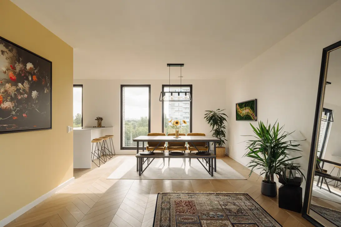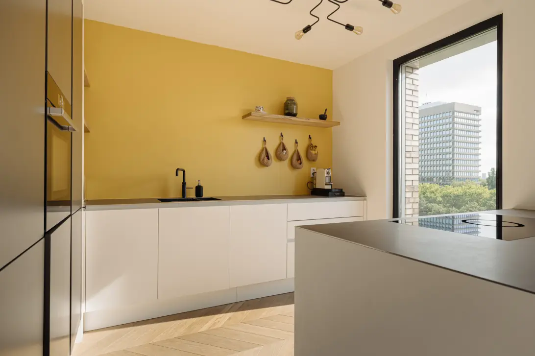 De open woonkamer en eetruimte baadt in natuurlijk licht dankzij de grote ramen, die een adembenemend 180-graden uitzicht over Amsterdam bieden. Elegante visgraat houten vloeren, zwart omlijste glazen deuren en verfijnde designdetails geven de ruimte een boutique en eigentijdse uitstraling. De moderne keuken is voorzien van hoogwaardige ingebouwde apparatuur, waaronder een vaatwasser, inductiekookplaat met recirculatie-afzuigkap, oven, koelkast en een aparte vriezer. Een strak vormgegeven werkeiland maakt het ideaal voor ontspannen ontbijten of stijlvol entertainen.