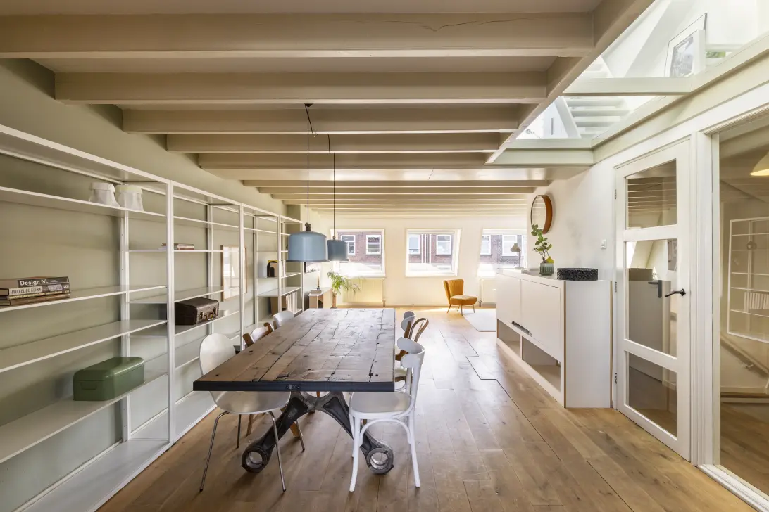 This light-filled and spacious double upper house of approx. 117 m² offers a thoughtful layout spread across two full floors. The lower level features a welcoming living area with solid oak flooring, three large windows, and a distinctively designed open-plan kitchen. Upstairs, you’ll find two bedrooms—with potential for a third—a mezzanine, a bathroom, and a generous sunny roof terrace (18 m²). Natural light, original rooflines and high-quality finishes add both character and comfort. The property is freehold and located on a lively street near Oosterpark, the Dappermarkt, and the vibrant Javastraat, home to cafés, restaurants, shops and all essential amenities.