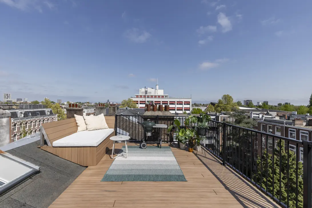 Vanaf de overloop leidt een vaste houten trap direct naar het dakterras op het zuidwesten. Het terras is recent vernieuwd en heeft een bank met opbergruimte en ruimte genoeg voor een barbecue en zithoek. Een ideale plek om van ’s ochtends tot ‘s avonds in de zon te genieten van het weidse uitzicht over de stad.