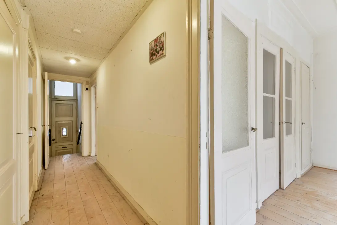 Very spacious double ground-floor apartment with a living area of ??139.2 m² and a sunny garden of approximately 55 m². The apartment is part of a characteristic building dating from 1885, situated on its own land. Because this ground-floor apartment is delivered as a shell, there is a unique opportunity to renovate it entirely to your own taste and wishes.