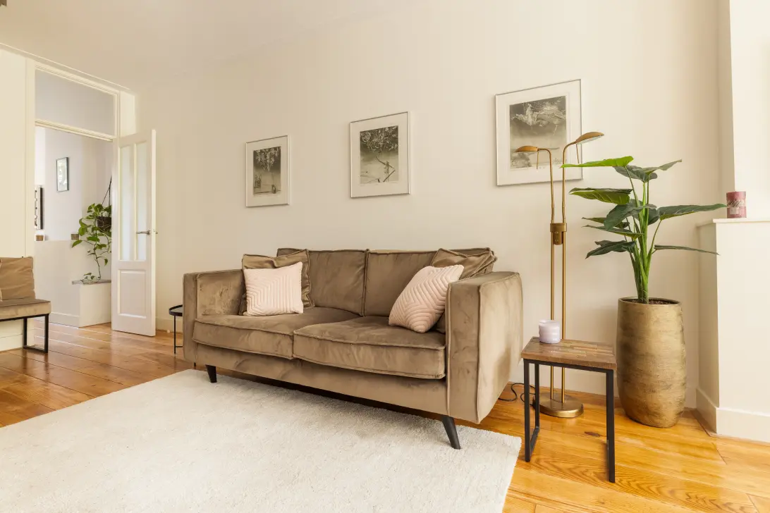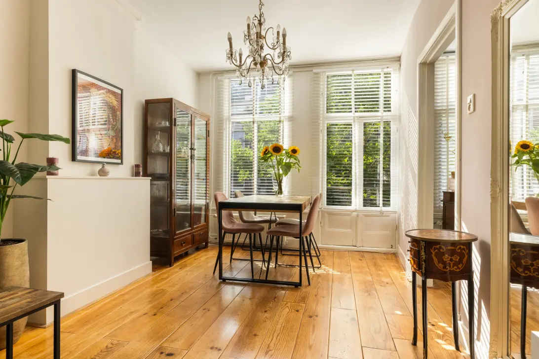 Je komt binnen in de hal die toegang geeft tot de verschillende vertrekken. De woonkamer ligt aan de voorzijde en is heerlijk licht door de grote ramen en openslaande deuren van het Franse balkon. De brede houten vloerdelen en hoge plafonds zorgen voor een warme, authentieke sfeer.
