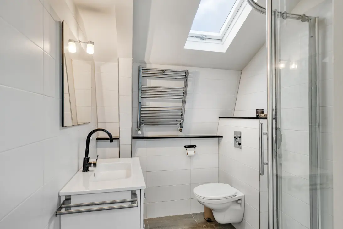 De overloop biedt toegang tot twee slaapkamers, beide netjes afgewerkt. De badkamer is modern ingericht met een ruime inloopdouche, toilet en een wastafelmeubel. De afwerking is strak en verzorgd, zodat je hier direct comfortabel kunt wonen.