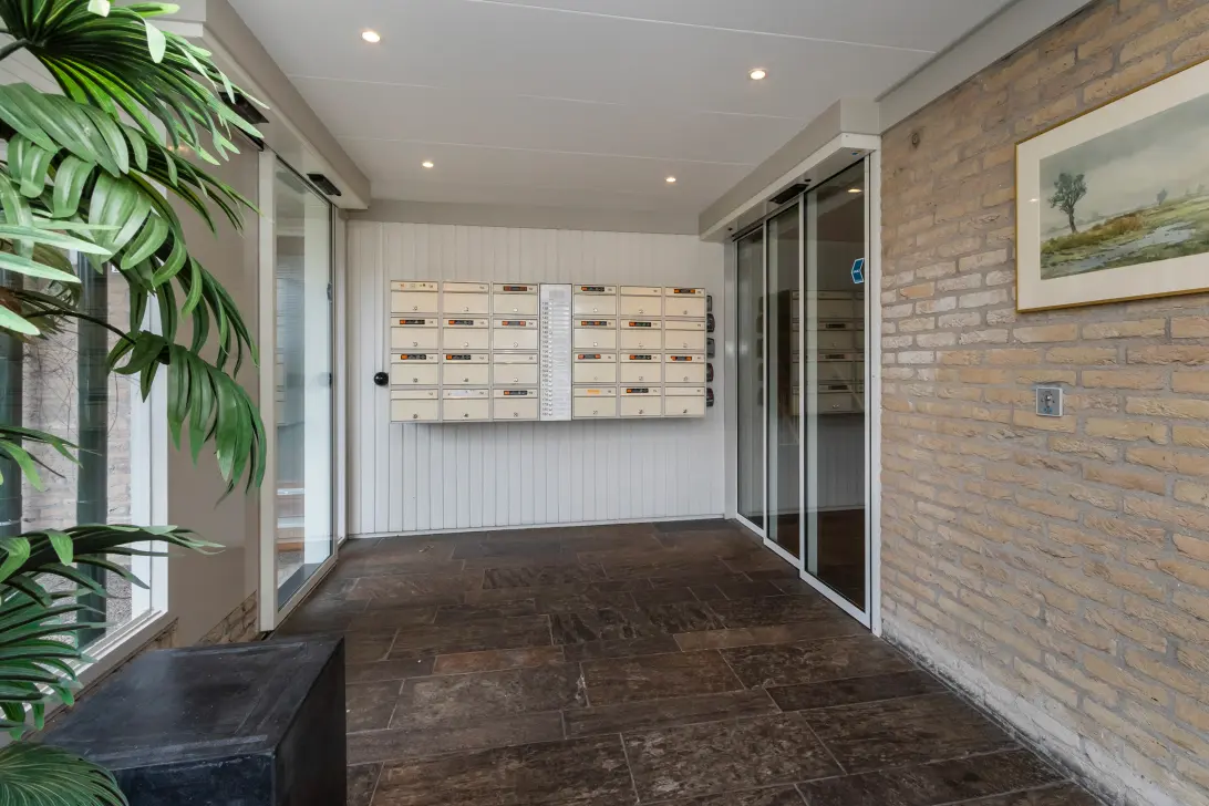 Afgesloten portiek met elektrische deuren. Vanuit de centrale bereikt men met de lift of de trapopgang de eerste verdieping.