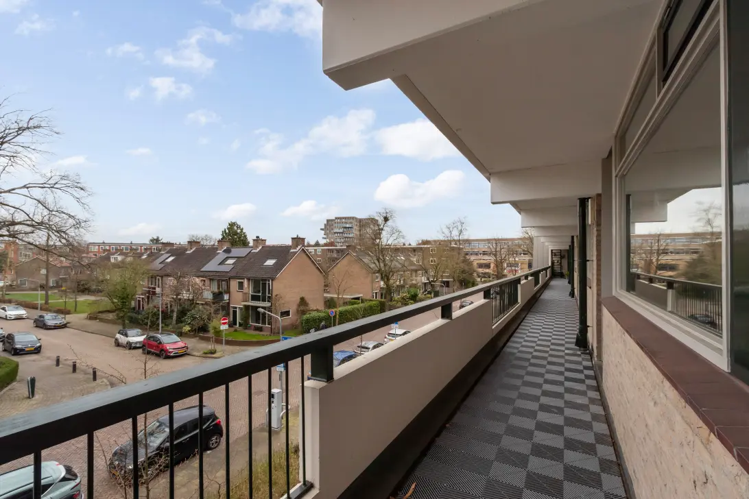 Hal, moderne meterkast, ruimte voor garderobe, gemoderniseerd toilet met fontein, heerlijk ruime en lichte woonkamer met open keuken en toegang naar het balkon. De keuken is ruim van opzet en biedt mogelijkheid om een eethoek te maken. Hoofdslaapkamer ook met toegang naar het balkon en vaste kast voorzien van elektrische boiler, tweede slaapkamer ligt aan de galerij kant, tevens de koele kant van het appartement. Moderne badkamer (2023) met inloopdouche en wastafelmeubel.