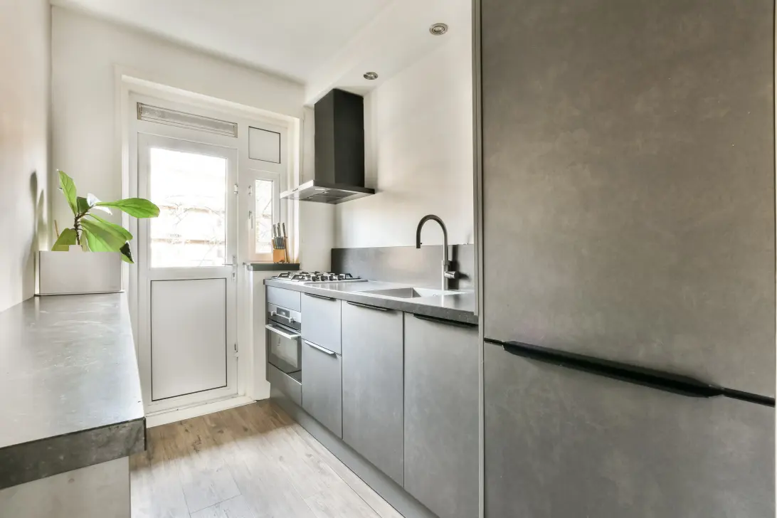 Aan de achterzijde van het appartement liggen twee ruime slaapkamers. Centraal tussen deze kamers bevindt zich de moderne keuken uit 2021, praktisch gesitueerd en met directe toegang tot het balkon.
