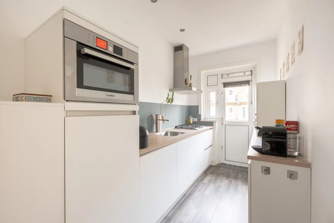 De moderne, greeploze keuken ligt eveneens aan de achterzijde en is voorzien van diverse Bosch-inbouwapparatuur, waaronder een combimagnetron, koelkast met vriesvak, vaatwasser, afzuigkap en een wasmachine/droger. Ook vanuit de keuken is er toegang tot het balkon met uitzicht op de verzorgde binnentuin.