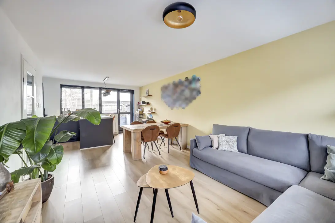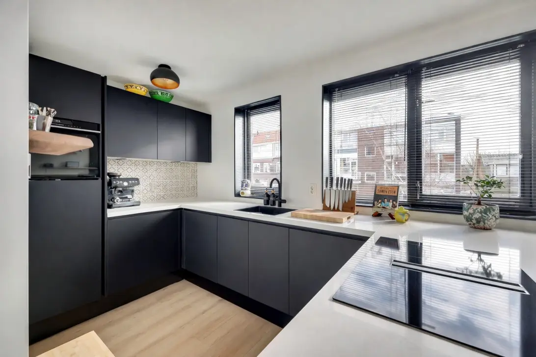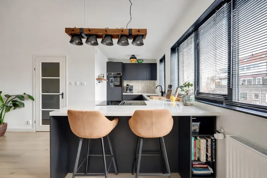 De woning heeft een eigen voordeur met opgang naar de eerste verdieping. Hier kom je binnen in een lichte, ruime woonkamer met een moderne open keuken (2024) die direct in het oog springt. De keuken is volledig uitgerust met inbouwapparatuur – koelkast, vriezer, combi-oven, vaatwasser en een inductiekookplaat met geïntegreerde afzuiging – en beschikt over een royale bar. Hierdoor blijf je tijdens het koken altijd in contact met je gezelschap: ideaal voor lange avonden samen koken, eten en borrelen.