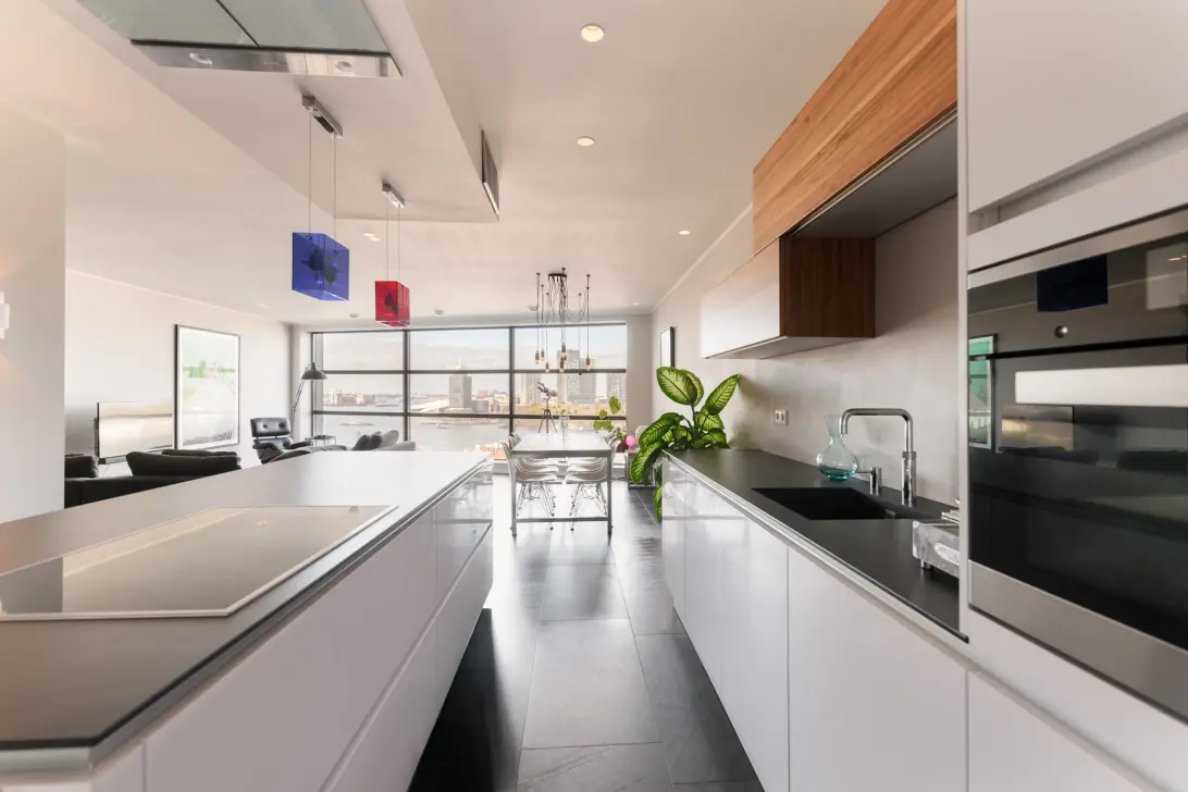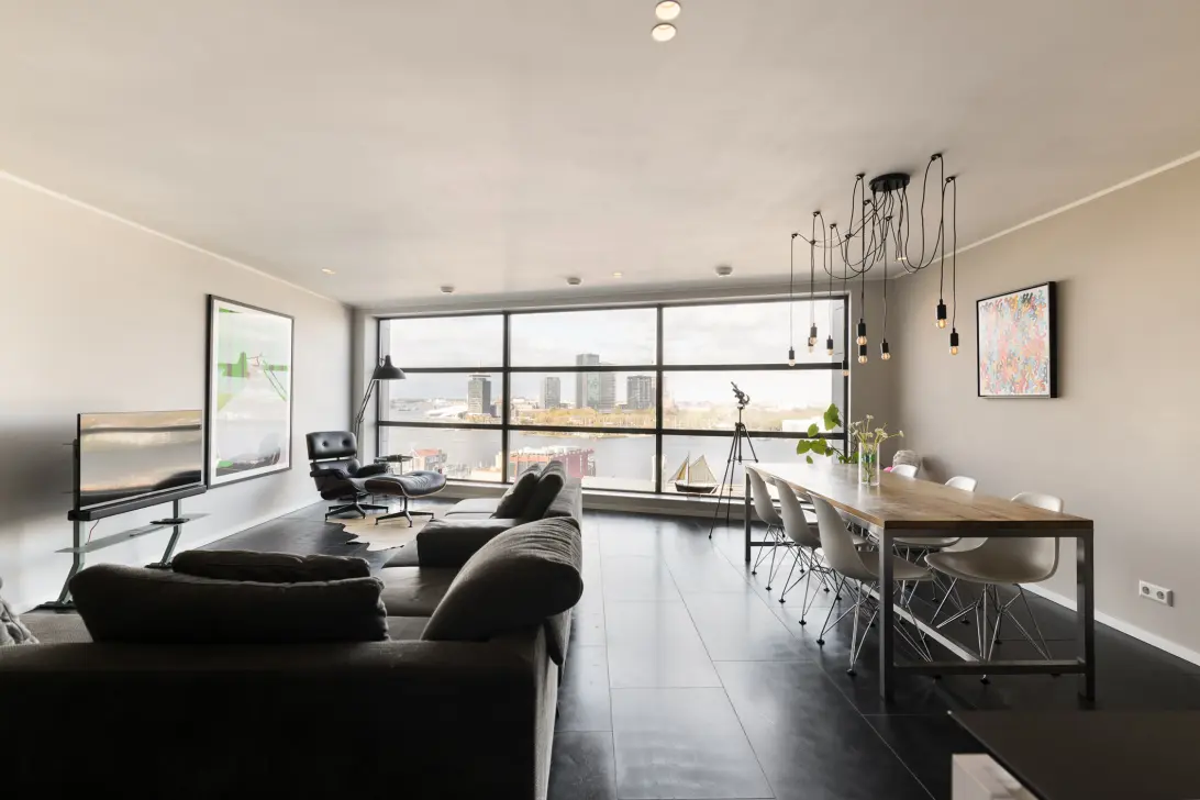 De royale living is een echte eyecatcher: dankzij de kamerbrede raampartijen stroomt het daglicht binnen en kijk je uit over het IJ, Amsterdam Noord en de voorbijvarende schepen. In de woonkamer zijn stijlvolle inbouwkasten geplaatst die zorgen voor extra opbergruimte zonder afbreuk te doen aan het interieur.