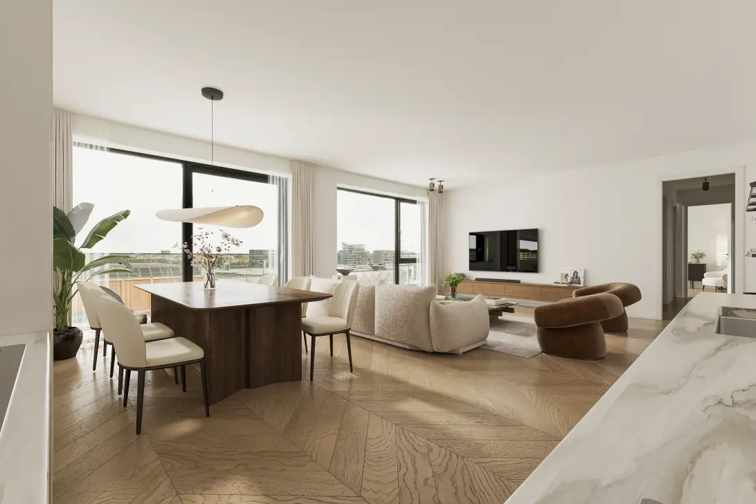 De woning is afgewerkt met een Belgische hardstenen vloer met vloerverwarming en -koeling. In het hele appartement zijn inbouwspots verwerkt.