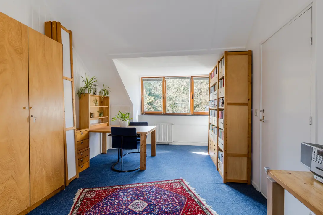 Via de open trap bereiken we deze verdieping. Hier treffen we slaapkamer nummer vier aan. Deze ruime kamer heeft aan de voorzijde een dakkapel. Hier kan nog een vijfde slaapkamer of werkkamer gemaakt worden. Ook tref je op deze verdieping drie Velux dakramen aan. Op de overloop is de cv-installatie te vinden en de aansluitingen voor het witgoed. Er is ook nog afgesloten bergruimte te vinden.