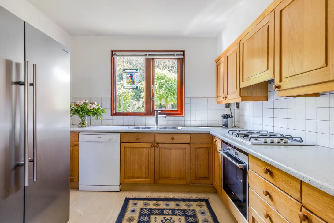 Via de deels bestrate, deels groene voortuin met houten (fietsen)berging bereiken we de voordeur van de woning. Entree met garderobe en meterkast, zwevend toilet met fonteintje, trapopgang naar de eerste verdieping en toegang tot de woonkamer met open keuken. De lichte woonkamer is tuingericht en heeft aan de achterzijde een breed raam en een openslaande deur naar de tuin. Hier is ruimte voor een zithoek en een eventuele werkplek. Aan de voorzijde is de L-vormige keuken gesitueerd met een elektrische screen als zonwering. De keuken heeft houten fronten en is voorzien van diverse inbouw- en losse apparatuur. In de woonkamer bevindt zich een ruime trapkast, de muren en plafonds zijn strak afgewerkt en de ruimte wordt verwarmd door luchtverwarming en infraroodpanelen. Op de vloer ligt laminaat. Zonwering door een groot uitvalscherm, pas drie jaar oud.