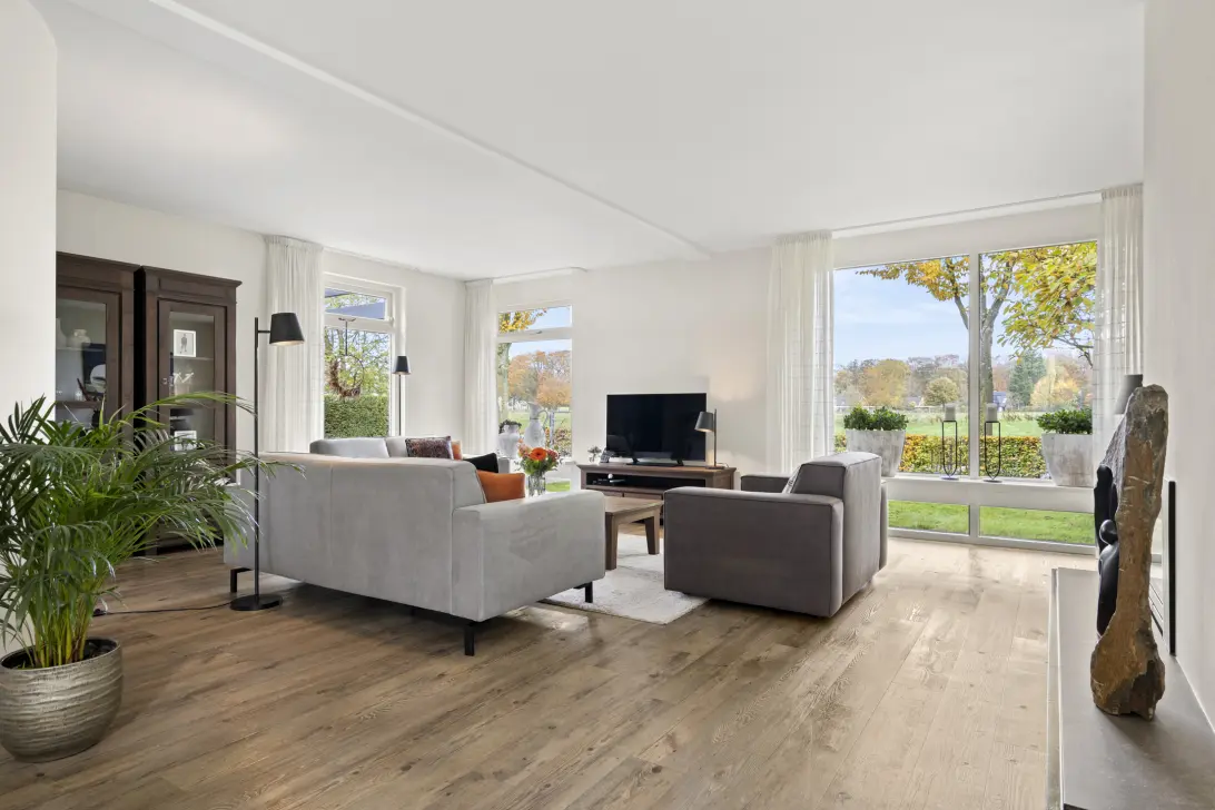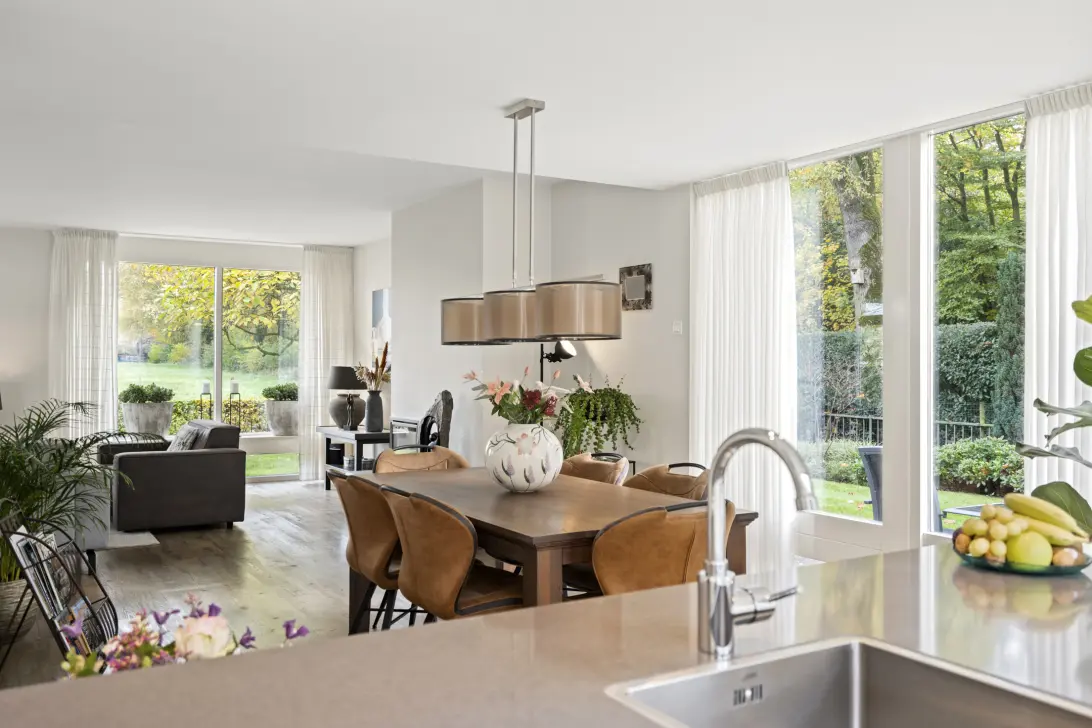 De woonkamer is een oase van licht en rust. Grote ramen laten het daglicht rijkelijk binnen en bieden een prachtig uitzicht op het groen rondom de woning. Hier geniet u van een ruimtelijk gevoel en een warme, uitnodigende sfeer. De houten vloer, de neutrale kleuren en de stijlvolle afwerking zorgen samen voor een tijdloze uitstraling. De indeling is praktisch én gezellig. Er is volop ruimte voor een comfortabele zithoek bij de sfeervolle haard, terwijl u vanuit iedere hoek contact houdt met de tuin en het buitenleven. Dankzij de grote raampartijen vloeien binnen en buiten op natuurlijke wijze in elkaar over. Kortom, een heerlijke plek om te ontspannen, te genieten van het uitzicht en echt thuis te komen.