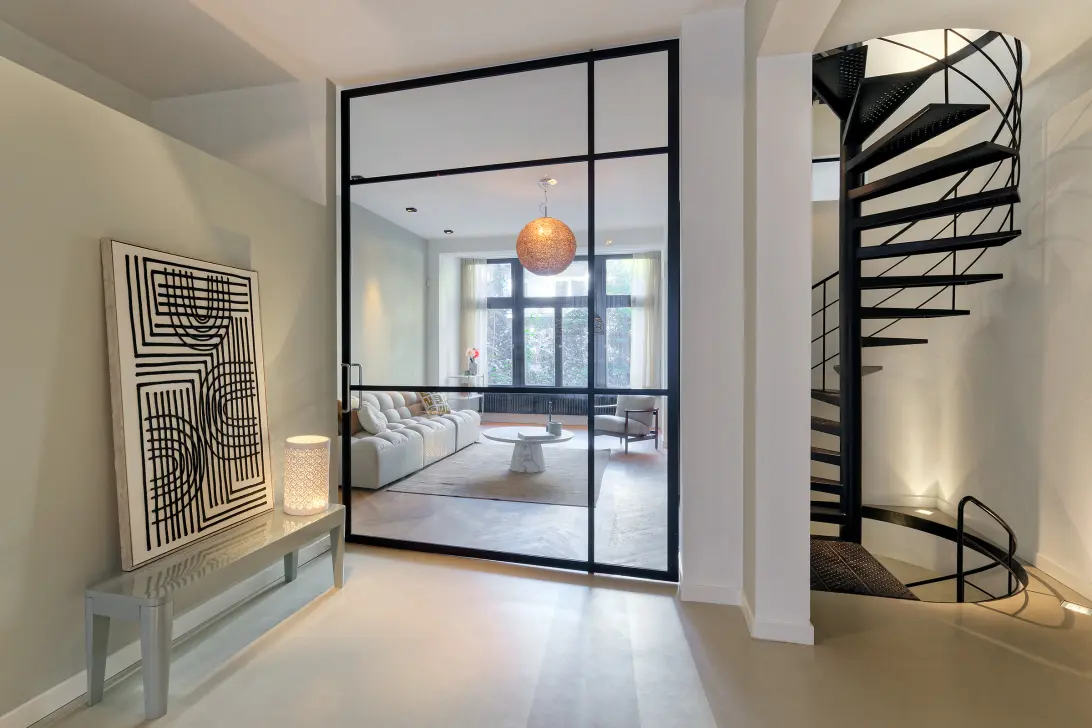 Via de statige voordeur betreedt u de ruime hal vanwaar de woning toegankelijk is. Binnenkomst op de bel-etage: de voorzijde van de bel-etage, welke door een vide in open verbinding staat met het souterrain, heeft een gietvloer en beschikt over een ruime garderobe en biedt eventueel ruimte voor een vleugel of een werkplek. Via een plafondhoge glazen Taatsdeur bereikt u de royale living met open haard, eiken houten parketvloer (Hongaarse punt) en uitzicht op de tuin.