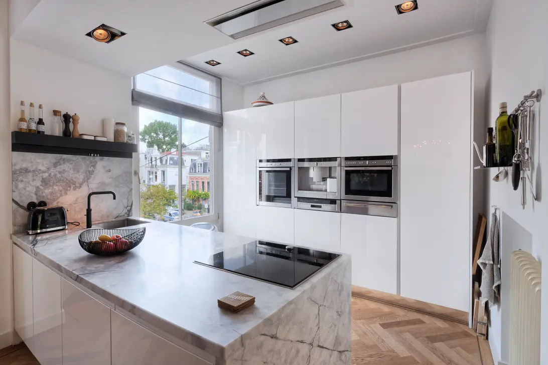 Layout: entrance with intercom system, well-maintained staircase to the second floor with the entrance to the apartment. Hallway with a spacious toilet, built-in closet with meter cupboard and coat rack, and a beautiful high steel door leading to the living room with herringbone parquet flooring and a gas fireplace with a beautiful marble mantelpiece. The seating area of the spacious, inviting L-shaped living room is located at the rear and provides access to the wide, sunny balcony. The dining area is at the front and features a bay window with views over Willemsparkweg towards Vondelpark. Adjacent is the modern open-plan kitchen with a light marble cooking island. The kitchen is equipped with all desirable appliances, including a Quooker, an induction cooktop, a dishwasher, a fridge-freezer, two ovens, a plate warmer, and an espresso machine. A stylish staircase leads to the third floor: landing with chic herringbone flooring, spacious storage cupboard with a high-efficiency combi boiler, and staircase to the roof terrace. A spacious, luxurious dressing room with custom-made wardrobes leads to the master bedroom, located at the rear of the house. The luxurious bathroom features a vanity with a double sink, a designer bathtub, a wall-hung toilet, and a walk-in shower with a thermostatic mixer, hand shower, and rain shower head. At the front of the house is a second spacious bedroom with an en-suite bathroom featuring a shower, vanity, designer radiator, and washing machine connections.