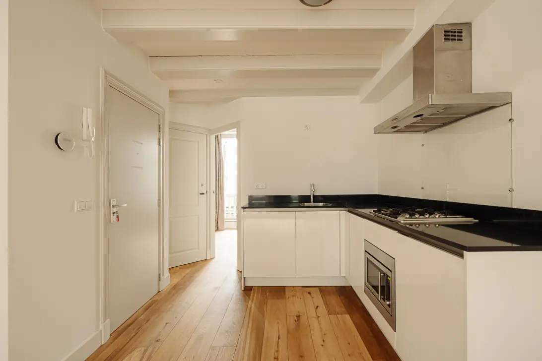 Sfeervolle tweekamer woning van 44m2 op de eerste verdieping, met een lichte woonkamer en een klein balkon.