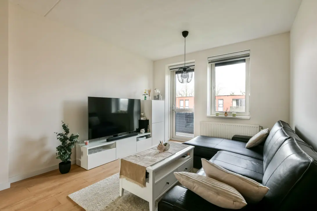 De woonkamer is licht en ruim opgezet, met grote ramen die zorgen voor een prettige natuurlijke lichtinval. De moderne afwerking maakt dat je hier direct kunt intrekken zonder te hoeven klussen. Vanuit de woonkamer heb je toegang tot het ruime balkon, waar je heerlijk kunt ontspannen.
