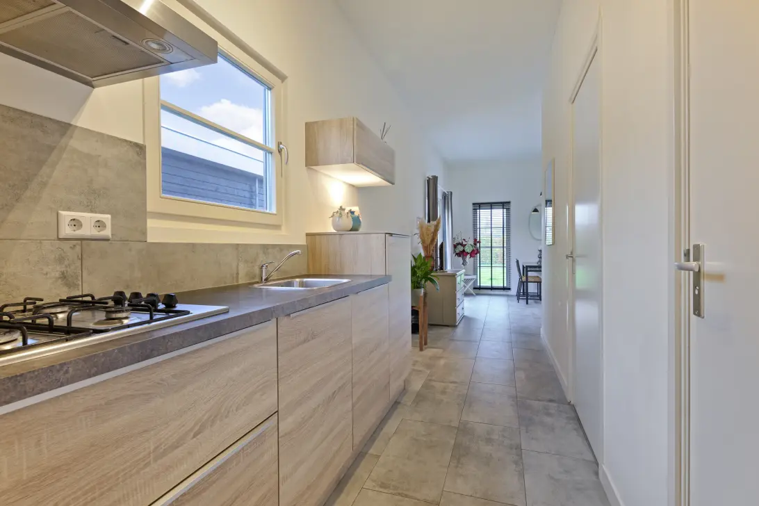 Parkeren voor het chalet voor 1 auto (bezoekers kunnen nabij parkeren op algemeen gedeelte op het park). Terras/veranda grind langszijde (op het oosten). Grote lichte gezellige woonkamer met hoog plafond met grote ramen en dubbele deur naar terras (kunststof kozijnen/ramen/deuren met isolerende beglazing HR++). Open moderne keuken met raam voorzien van 4-pits gas, afzuigkap, spoelbak, afwasmachine en koelkast. Badkamer met wastafelmeubel, inloopdouche met glazen deur, designradiator en wasmachine-aansluiting. Verder beschikt het chalet over 2 slaapkamers.