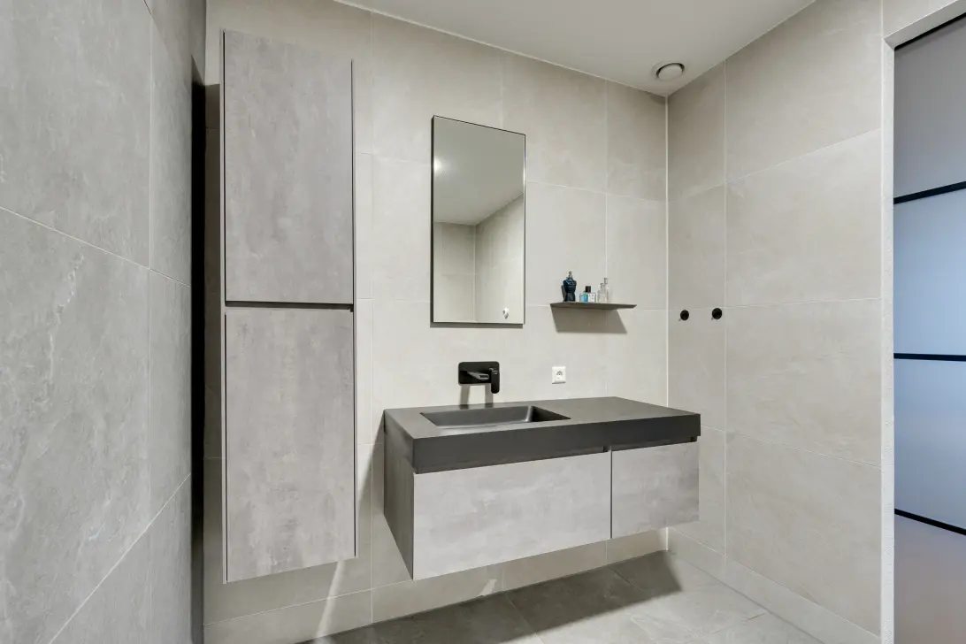 De begane grond is bijzonder ruim. Deze woonlaag is voorzien van een ruime woonkamer, grote open woonkeuken met kookeiland, een hal met toilet, slaapkamer en badkamer, die is voorzien van een tweede toilet, wastafel en inloopdouche.